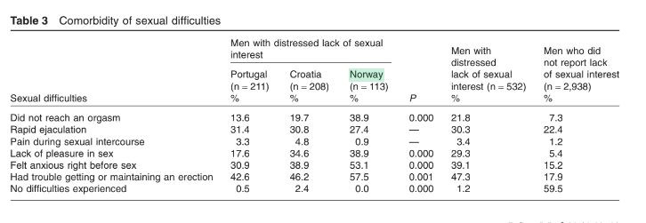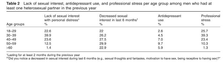 O stress profissional foi o motivo mais vezes relatado associado à falta de vontade sexual. As conclusões do estudo referem que a falta de desejo sexual entre os homens heterossexuais está associada a variáveis intrapessoais (como a confiança na função erétil), interpessoais (duração da relação, atração do parceiro) e socioculturais. No estudo também se determina que a falta de desejo sexual tem sido mais estudada nas mulheres em detrimento dos homens.
